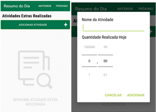 Atividades Extras Realizadas: Clique em Adicionar Atividade para inserir atividades extras que foram realizadas na OS, mas que não estão na lista de atividades. Ao abrir, digite o nome da atividade e a quantidade de vezes que ela foi realizada.