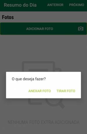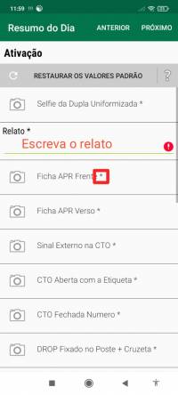 Resumo do Dia: Após o Check-out, será exibida a página Resumo do Dia, relacionada à atividade da OS. Nesta etapa, insira fotos de documentos e registros do que foi realizado até o momento. Você também pode começar a preencher seu relato sobre a execução da tarefa.