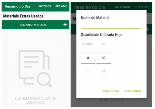 Materiais Extras Utilizados: Clique em Adicionar Materiais Extras para inserir materiais extras que foram usados na OS e não estão na lista de materiais. Ao abrir, escreva o nome do material e a quantidade utilizada. Da mesma forma, clicando no ícone de lápis, você pode alterar a quantidade utilizada de determinado material.
