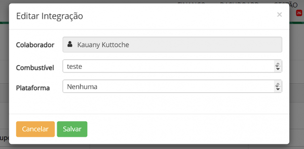 A tela Integração permite vincular os combustíveis cadastrados aos colaboradores que irão utilizá-los. Além disso, você pode definir, de forma opcional, em qual plataforma o valor calculado do combustível será inserido, como por exemplo a Ticket Log.