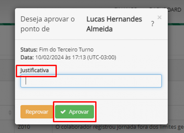Ponto de terceiro turno aguardando aprovação: Quando o colaborador ultrapassa o horário do segundo turno, o sistema gera automaticamente um terceiro turno (hora extra), que precisa ser aprovado.