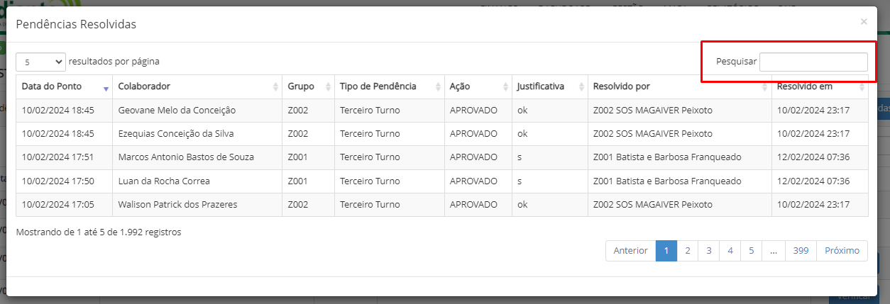 A tela Registros de Jornada Pendentes permite visualizar e gerenciar registros de jornada com pendências. Nela, é possível adicionar justificativas, consultar pendências já resolvidas e aprovar ou reprovar registros pendentes.