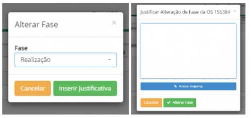 1. Alterar Fase: Selecione a fase que quer mandar a OS e justifique a ação.Caso a OS fique com duas equipes ambas precisam tirar todas as fotos obrigatórias para concluir a OS.