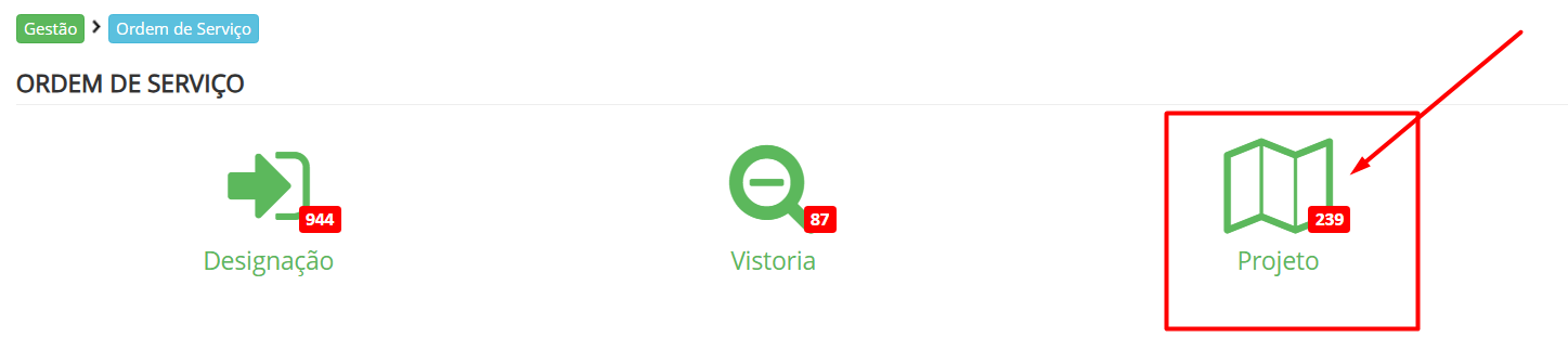 A tela “Projeto” serve para a visualização dos orçamentos que foram aprovados e estão em fase de validação da Ordem de Serviço (OS). Após essa validação, a OS segue para a etapa “Aguardando Cliente”.
