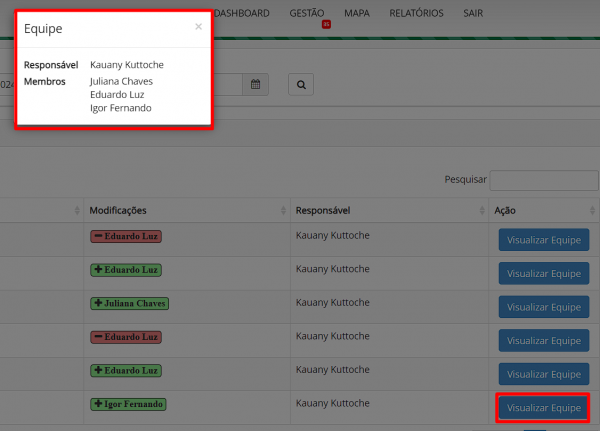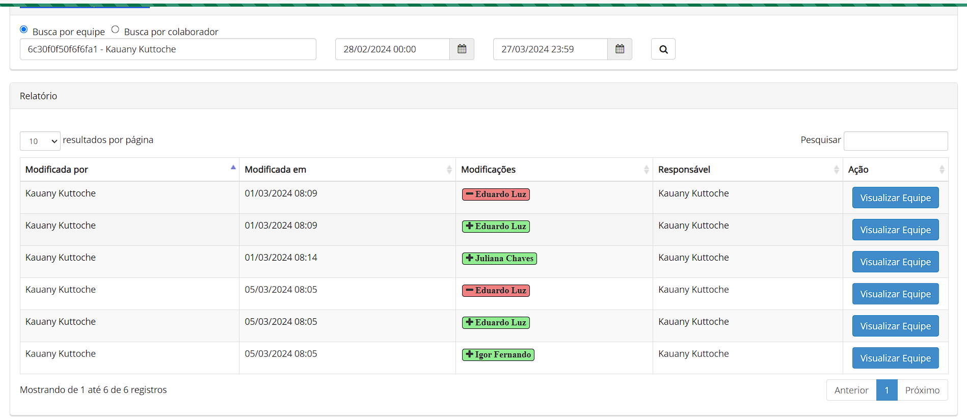 A tela “Equipes” permite consultar um relatório com o histórico de modificações realizadas em uma equipe. Nela, é possível acompanhar alterações como adição ou remoção de membros, mudanças de permissões e outras atualizações relacionadas à estrutura da equipe.