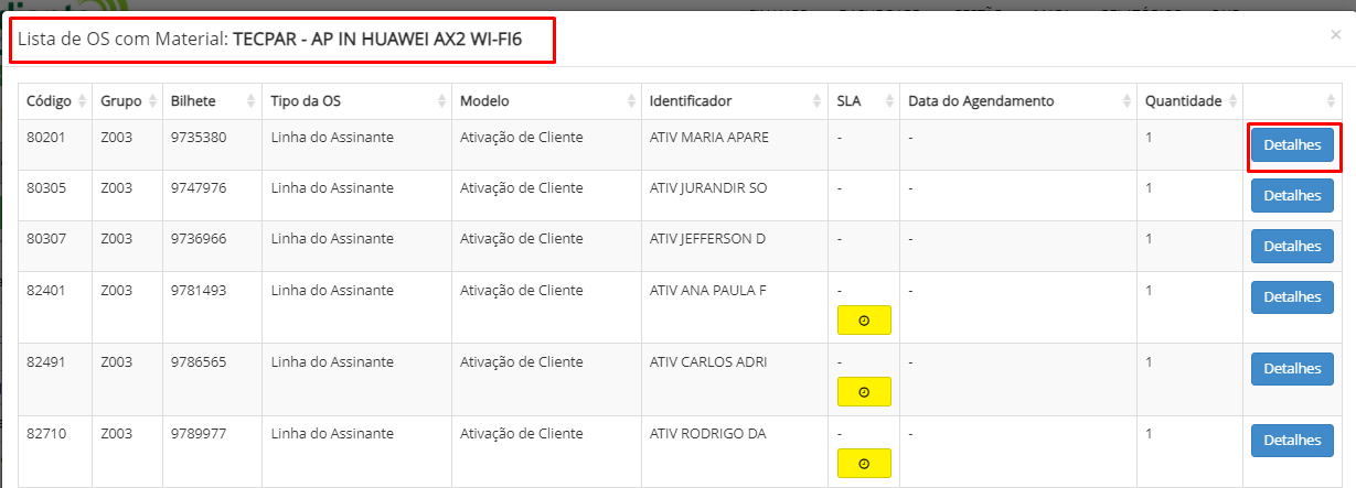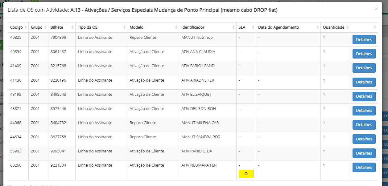 OS que tiveram essa atividade. Caso queira, clique em detalhes para poder visualizar mais informações de uma